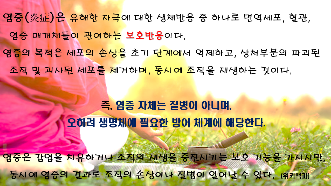 염증 자체는 질병이 아니며, 오히려 생명체에 필요한 방어 체계에 해당한다.